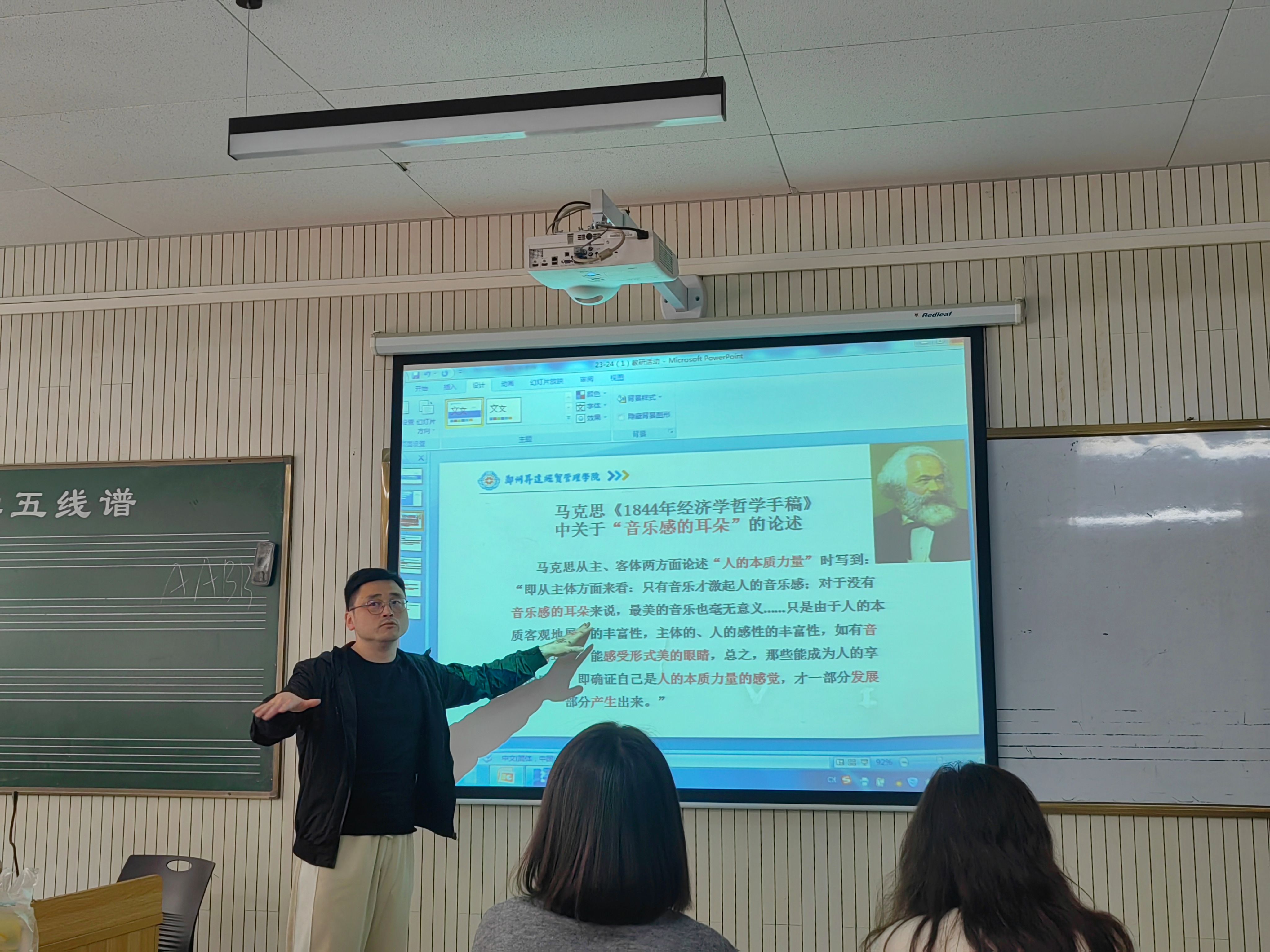 王叶老师主要围绕课程内涵、教学内容设计,以及课堂教学心得等方面进行了教学分享。首先,王叶老师根据《基础和声》课程的内涵进行了解读,并引用了19世纪文献中关于“培养音乐的耳朵”的论述:有音乐感的耳朵,能感受形式美的眼睛,确证自己是人的本质力量的感觉,而只有音乐才能激起人的音乐感。通过引经据典的解读,使老师们认识到了《基础和声》作为音乐专业理论课程的基础性与重要性。