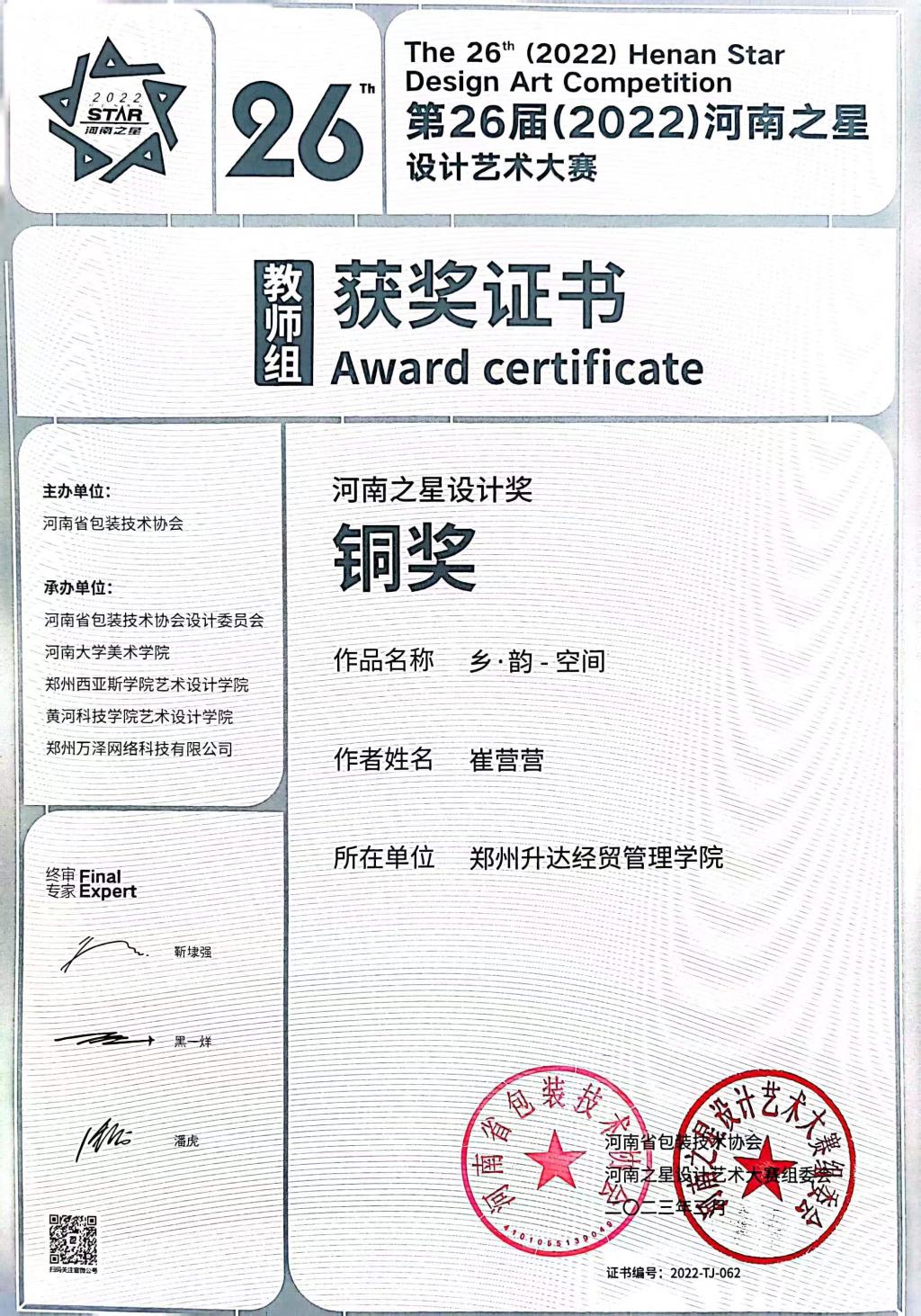 如何提高专业的教育教学质量,提升学生设计实践能力,一直以来都是学院高度重视的问题。为抓牢抓实此项工作,学院领导多次组织教研室探讨以赛促教,教学相长的实施方案,鼓励师生积极参加设计大赛。本次获奖是我院师生继2022年1月河南省第三届“创意河南”艺术设计大赛之后的又一次获奖成果。在本次河南之星设计艺术大赛中,我院共取得奖项五项。其中,环境设计专业教师崔营营老师的作品《乡·韵—空间》获得教师组铜奖,环境设计专业王潇楠和刘利珂同学的作品《庆唐春—空间设计》获得学生组佳作奖,周玉琪同学的作品《荥阳玉门古渡景区概念性方案设计》和吴京书同学的作品《杨水才纪念馆景区改造设计》均获得学生组佳作奖,我校被授予“第26届河南之星优秀组织奖”。